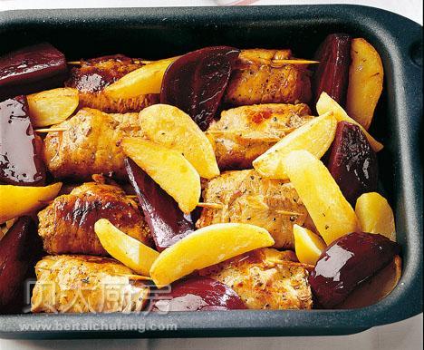 猪通脊6片(厚0.5cm,每片约100g),橄榄油2汤匙(30g),土豆200g(削成橄榄形),瑞士硬奶酪150g(切3cm长条),红菜头200g(切半圆片),盐1茶匙(5g),黑胡椒碎1/2茶匙(3g),辣椒粉1/3茶匙(2g)
