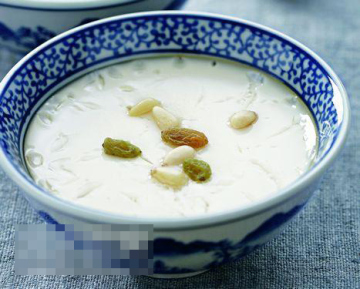 牛奶500ml,酒酿150ml,绵白糖2茶匙(10g),松仁10g,葡萄干10g
