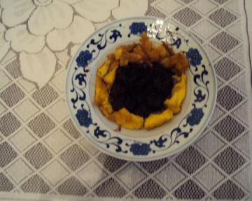 3、把剩下的蛋黄也不要浪费,打发后入油锅做成炒蛋,但注意不要用锅铲炒碎。把炒蛋切成条状,镶在盘边,就可上席。
