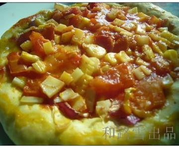 2、把发酵好的面团擀成饼状,抹上一层番茄汁,铺上各种辅料,最后铺上切碎的奶酪和黑胡椒,放入有烧烤功能的微波炉烘烤出炉,切成小块即成。