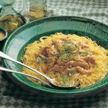 去骨去皮鸡脯500克,大蒜4—6瓣,第戎芥酱2汤匙,番茄茸1汤匙,葡萄酒醋2汤匙,清鸡汤或清水4汤匙,大葱4根,橄榄油2汤匙,意大利细面250克,盐、黑胡椒适量,太白粉(生粉)2茶匙,一次分离稀奶油225毫升