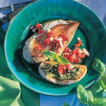 去骨去皮鸡脯4块,每块约175克,意大利乳清乳酪100克,香蒜酱5汤匙,橄榄油2茶匙,黑胡椒适量,大番茄2个,小红洋葱1颗,大蒜1瓣,罗勒叶1小把,意大利面包1个