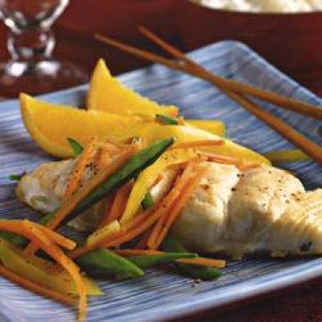 大比目鱼4块(约680克)或其它肉质密实的白肉鱼排,酱油2汤匙,白酒或日本清酒2汤匙,生姜1片,削皮切丝,中等大小的胡萝卜2根,削皮切丝,荷兰豆(豌豆荚)60克,去筋络后纵切成两半,黄甜椒1/2个,去籽后切丝