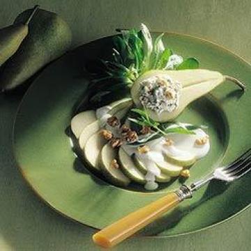4.剩余的酸乳酪缓慢地搅拌,加进第二个小碗的混合乳酪中。加入酒醋,调成柔滑的酱汁。用匙子小心地将酱汁浇在梨子上。剩下的核桃仁略剁,撒在梨子四周,用莴苣叶或龙蒿枝装饰后立即上桌。