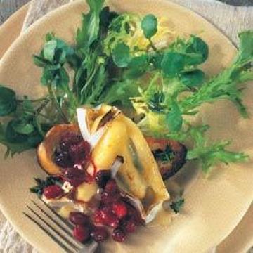 新鲜或冷冻越橘175克,红糖40克,柳橙1小个,荷兰芹2—3大枝,细香葱1小把,新鲜百里香1小枝,大蒜1小瓣,橄榄油2汤匙,黑胡椒适量,硬面包1条,法国卡门伯特熟乳酪1个,西洋菜与卷叶莴茞(friseelettuce)叶适量