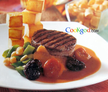 牛柳360克,杂干果80克(包括黄梅干、无花果干和西梅干等),橄榄油1汤匙,蒜茸2粒,红酒100毫升,白兰地酒2汤匙,黄汁100毫升,淇淋30毫升,盐和胡椒粉适量。