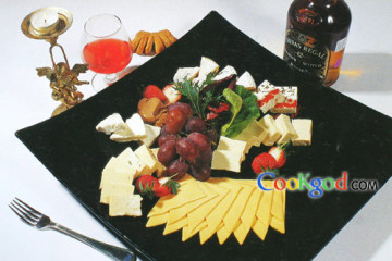(1)各种芝士切成不同形状的块或片,分别整齐地摆放在盆内,配上葡萄。