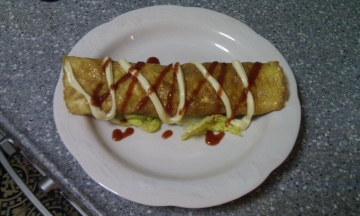 2、3个鸡蛋加盐打匀后,入锅煎,倒入炒好的料炒均匀,再撒上芝士条,等蛋熟后把它卷起来,装盆用番茄酱和色拉酱装饰。