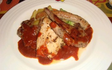 7、打开盖子,将剩下的1/4腌料加入搅拌。如果口味轻,可以不放。如果嫌颜色不够红,就使劲加paprika.