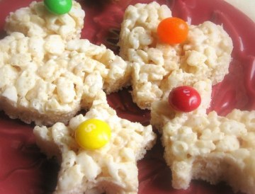 黄油先在锅里用中小火融化了,加入棉花糖不断的搅拌,直到棉花糖完全融化了 ,加入crispy rice米花,搅拌均匀,放入抹了黄油的13*9*2大小的烤盘里,用抹了黄油的勺子或铲子把它压平压实了等冷却后就可以切成块食用了。我这次切了些可爱的形状,放了m&m在面上,点点很喜欢。