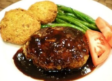 用煎过肉饼的锅, 加入 2tb水, 3tb日本底盐酱油, 4tb味霖 (mirin), 1tb worcestershire sauce, 1tb蒜泥, 1/3洋葱, 烧滚, 略收汁, 加 2tb黄油, 溶化后, 浇在肉饼上,