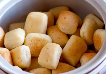 1. 預熱焗爐至華氏350度,將5-6塊麵包放在金屬焗盤上,每塊之間留些少空位