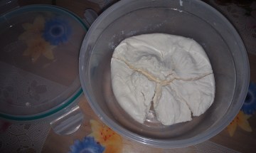 2.发酵好的牛奶会变成酸奶,加入盐搅拌让牛奶结成块状与乳清分离。(如果发酵不成功可以用电磁炉加温,一定要最小攻击力!不然就完了...)