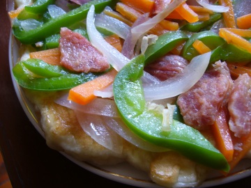 3.在醒面时可以制作配菜。把青椒、胡萝卜和洋葱洗净切丝,香肠切片(可根据自己的口味添加其它配菜)。