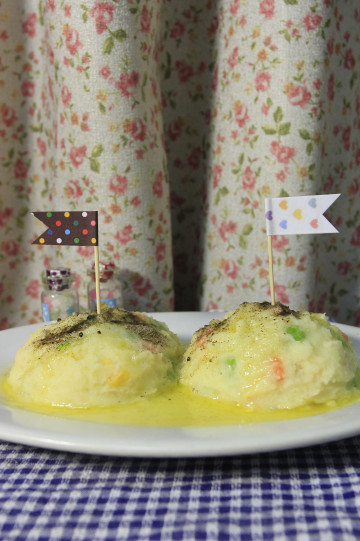 4、把土豆泥挖入小容器(布丁盒大小即可)后倒扣进盘子,左右两个。