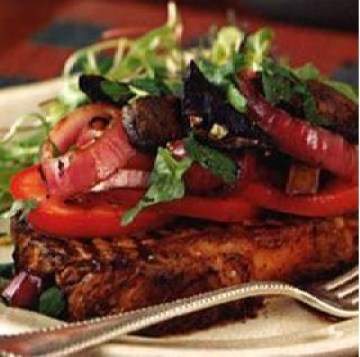 橄榄油2茶匙,大蒜2瓣,切末,红洋葱4片(0.5厘米宽),大褐菇(portobellomushroom)4个,去蒂瓶装喷雾橄榄油,无骨牛肋排(rib-eyesteak)2块(每块约340克),盐1/2茶匙,黑胡椒粉1/4茶匙,熟西红柿3个,细香葱(虾夷葱)或荷兰芹(洋香菜)少许,切碎