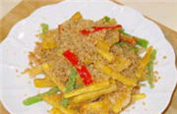2、起锅倒入油,待油温至5成热时,将薯条下锅炸透,再复炸一下,至外酥内熟时放入青红尖椒,一同捞出沥干油,将蒜茸、面包糠和炸好的红薯条一起放入锅中炒,加盐、胡椒粉、鸡精炒匀即成。