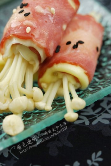 第一种:西餐菜谱金针奶酪培根卷做法