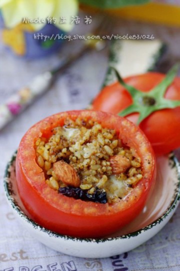 3.填入番茄盅的饭不宜太多,填满即可,以免烤时番茄裂开。