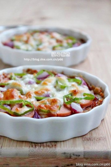 7.再放上火腿肠、洋葱和青椒放入烤箱烤10分钟,最后取出来撒上一层马苏里拉奶酪再烤5分钟即可