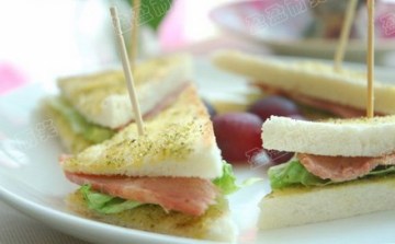 3、然后每片小三角上铺一片球生菜,再放一片用黄油煎过的培根,最后再放上一片小三角后用一根牙签固定即可。