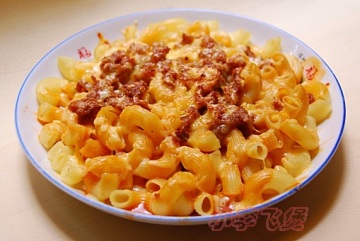 2.起镬放肉碎茄汁煮成肉酱,盛起铺在意粉上,再将芝士刨碎在肉酱上,用微波炉烧烤档加热8分钟即可.