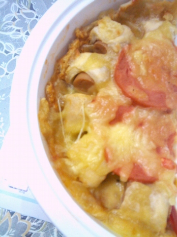 自发粉、水、盐、黄油、马苏芝士碎,鸡蛋、火腿、西红柿。