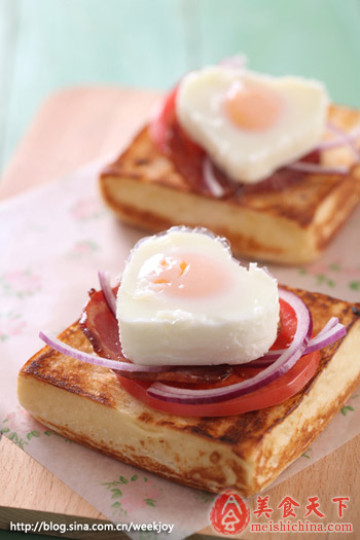 3、面包上铺蕃茄,培根,洋葱,蛋即可,或者自己喜欢的任何蔬菜。