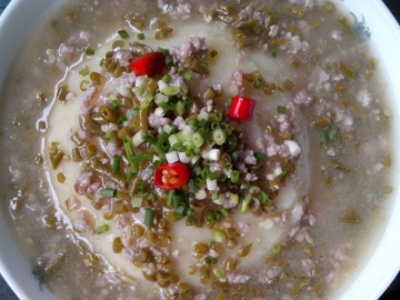 大土豆2个(500克),肉渣渣50克,泡豇豆4根,肉汤和棒子骨汤都可以,盐,鸡精,豆粉,葱花