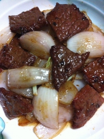 先把洋葱煸炒一下 备用 然后煎牛排 两面翻 掌握火候 不要太大 以免煎焦 差不多时 捞起 切小块 跟洋葱一起翻炒一下 放少许生抽 糖 味精 就ok了