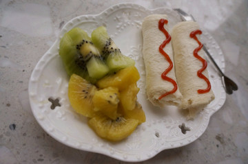 土司,肉松,蓝莓果酱(不添加色素及防腐剂),番茄沙司,绿/黄猕猴桃,纯牛奶