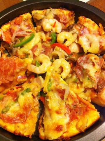 6、把发酵好的面饼铺在披萨盘里,用叉子在面皮上扎点小孔,然后涂抹上刚才做好的披萨酱,撒上奶酪丝,放上准备好的牛肉、虾仁、香肠、培根、蘑菇、洋葱、彩椒,再撒上奶酪丝就可以放烤箱烤制了,200度上下火,烤箱中层,20分钟!ok了!香喷喷的披萨饼出炉咯!