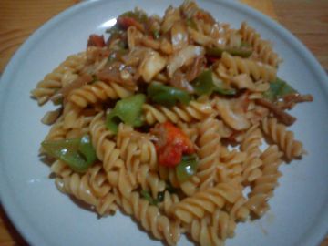 主料:意大利螺丝粉100克,麻椒1个,杏鲍菇1小个,腌制过的鸡柳1条