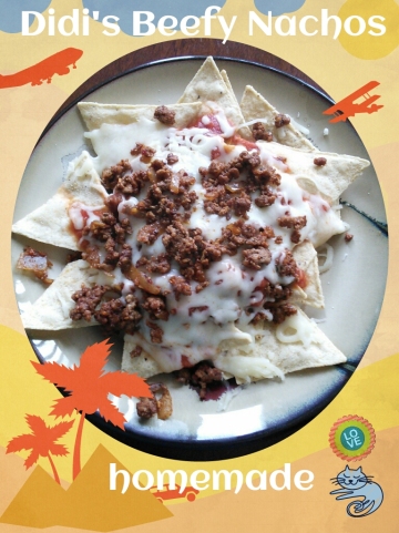 3、在盘子上放上玉米片(我喜欢用烤玉米片代替油炸玉米片)、牛肉、墨西哥蕃茄辣酱、芝士。