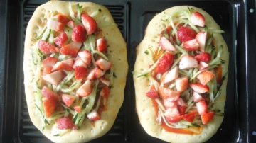 4、放入烤箱烘烤15分钟,然后取出,涂层番茄沙司,铺上黄瓜草莓即可。