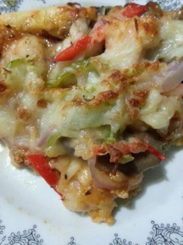 9、220c°上下火,烤箱中层,烤15分钟,然后上面再加上芝士继续烤5分钟就可以出炉享用了!香喷喷的海鲜牛肉披撒,配上牛肉罗宋汤,真是棒极了!