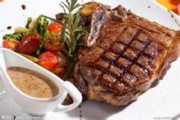 7、变了颜色后取出装盘,倒上黑胡椒酱。把薯条放在牛排边上,面包摆上。摆上刀叉即可。 大家快来试试,请关注我的新浪微博,我就是情感大师--------红唇女王