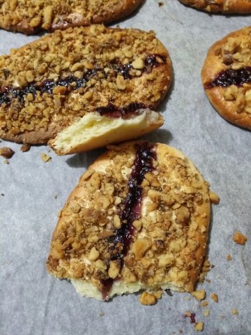 7、最后放入预热180度的烤箱中层,烤25分钟左右至核桃碎微黄未焦即可。焦黄的核桃碎,深紫色的蓝莓酱,再加上浓浓的奶酪香气,这等魅力,孰人能挡?