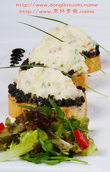 10. 将步骤(9)土豆泥,放在烤香的切片面包之上,周围用步骤(7)黑橄榄粒围边装盘,用芝麻叶、罗沙红生菜、叶生菜、圣女果片装饰即可。