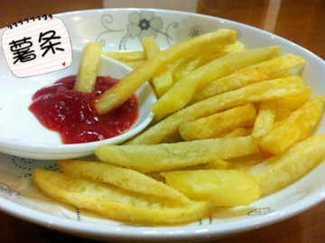 把煮过的马铃薯捞出沥干水分,平铺冷却。小火慢慢炸至金黄(加一点点盐)。把炸到金黄色的薯条沥干油,出锅,薯条就作好了.这就是原味薯条.趁热,挤上番茄酱就可以了。mm们是不是很简单呢?
