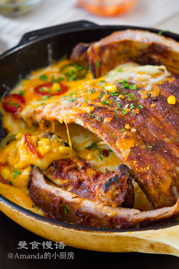 11、取出排骨,将烤箱再一次升温至200°c。准备一个可以进烤箱的平底锅,把排骨放进去,把芝士碎撒在旁边,点缀上泡辣椒和玉米粒。