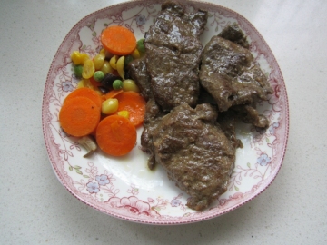 牛排1个,胡萝卜、玉米、豌豆、黄油少许。