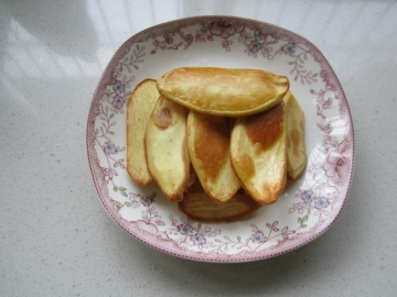 (1).红薯洗净削去皮,在水中洗去涩液,切成1厘米厚的片,苹果洗净去籽,切成同薯片大小,放盐水中洗一下待用。