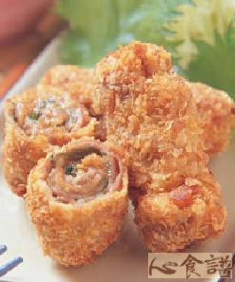 5.用作法4包住作法3,依序沾上低筋面粉、蛋液、面包粉,以170℃油温炸至肉浮起,再提高至180℃油温,炸至呈金黄酥脆后夹起沥油。