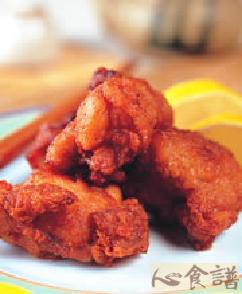 5.将作法4的鸡块放入170℃的油锅中炸熟,再提高油温至190℃炸至鸡块酥脆,即可盛盘,以柠檬片装饰即完成。