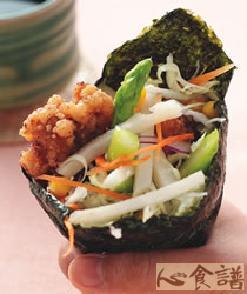 3.取一片海苔置于手心,依序放上综合蔬菜、作法2的炸鸡块,再挤入美乃滋,顺势垂直包裹捲起呈倒三角锥状,即为炸鸡手捲(包裹至炸鸡用毕)。