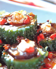 3.先取一段作法1的海参沾裹少许的太白粉,放入作法1山苦瓜中间凹处,再将已沾裹上少许太白粉的海参丸子放入海参的中间。