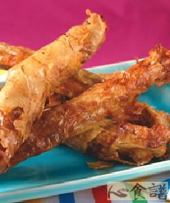7.热一锅,放入适量的油,待油温烧热至约120℃,将作法6的腐皮捲放入锅中,以中火炸约2分钟至米粉涨发酥脆即可。