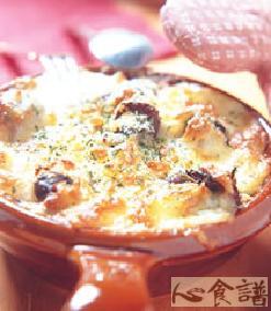 3.将作法2装入烤盘中,依序加入义大利香料、面包粉、起司丝、起司粉,再用230度烤箱略烤约5分钟至上色。