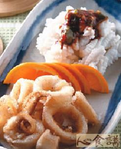 3.另取中卷2尾去皮、内脏洗净、切成圈状,以葱、姜、料理米酒腌约30分钟后,捞出沥干,沾裹太白粉备用。